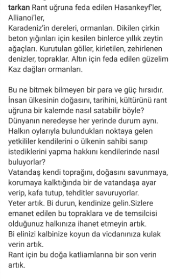 "Rant uğruna feda edilen Hasankeyf’ler, Allianoi’ler, Karadeniz’in dereleri, ormanları. Dikilen çirkin beton yığınları için kesilen binlerce yıllık zeytin ağaçları. Kurutulan göller, kirletilen, zehirlenen denizler, topraklar. Altın için feda edilen güzelim Kaz dağları ormanları.