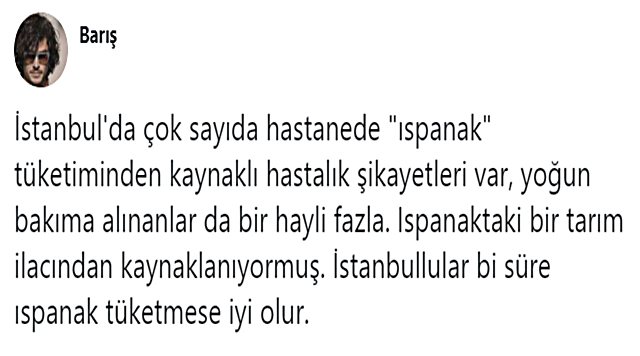 Konuya ilişkin açıklama yapan Yoğun Bakım Derneği, "Tarlalarda üretilen ispanaklara sıkılan böcek öldürücü ilaçların yol açtığı organofosfat zehirlenme nedeniyle başta İstanbul'da olmak üzere pek çok ilde zehirlenme vakalrına yol açmıştır" dedi, "En az 1015 ıspanak tüketmeyin" uyarısında bulundu.
